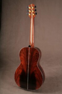 The parlor guitar is the smallest of the Olson Guitars. With its 12 fret neck and smaller size it is comfortable to hold and play. While not as robust sounding as its counterparts, it is well-balanced between the registers with a healthy amount of volume and projection. Most suitable for fingerstyle, it will handle flat pick also.