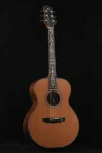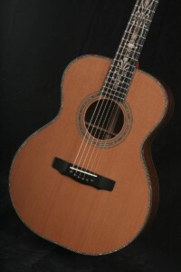 One of a kind Brazilian Rosewood SJ “Collector Series” guitar to commemorate Jim’s 35th Anniversary of making guitars. Options include an “LS” Redwood top, Paua top edge with 42 style fingerboard extension, Paua back edge perimeter and end wedge borders. Paua headstock perimeter edginging with a solid 14K gold infilled “O” logo on peghead. Wide Paua and Brazilian rosette. Brazilian peg head back veneer with WBW purfling. A Brazilian Rosewood neck featuring fingerboard inlay by Larry Robinson. The fingerboard inlay includes solid Gold vine work with various shells.