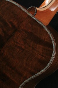 Highly figured Mahogany from the famous “Tree” written about in Fine Woodworking Magazine in 1985. Western red Cedar top. Paua top edge with Paua 42 style fingerboard extension. Paua back center strip and end wedge borders. Brazilian Rosewood and “wide” Paua rosette. Paua fingerboard and headstock perimeter edging. Full vine inlay on fingerboard with Paua infilled “O” on ebony headstock. Brazilian Rosewood peghead back veneer with WBW purfling and ebony edging