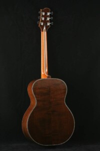 Curly Maple back and sides with a Sitka Spruce top. Paua top edge, back center strip and end wedge borders. Three ring rosette with Paua shell center. Paua doves with WBW fingerboard edge. A figured maple neck with maple head stock back veneer.