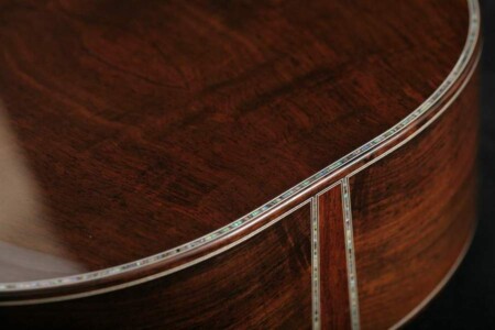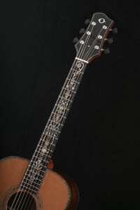 A highly figured Brazilian Rosewood SJ “Collector Series” guitar to commemorate the 1400th guitar Jim has made. Options include Paua top edge with 42 style fingerboard extension, Paua back edge perimeter and end wedge borders. Paua headstock perimeter edginging with a solid 14K gold infilled “O” logo on peghead. Wide Paua and Brazilian rosette. Brazilian peg head back veneer with WBW purfling. A Brazilian Rosewood neck featuring fingerboard inlay by Larry Robinson. The fingerboard inlay includes solid Gold vine work with various shells