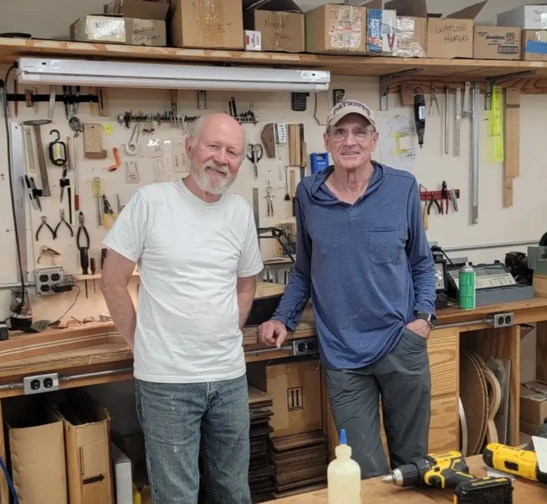 Jim Olson visiting his friend and early mentor Charlie Hoffman, at his shop Hoffman Guitars, in Minneapolis.